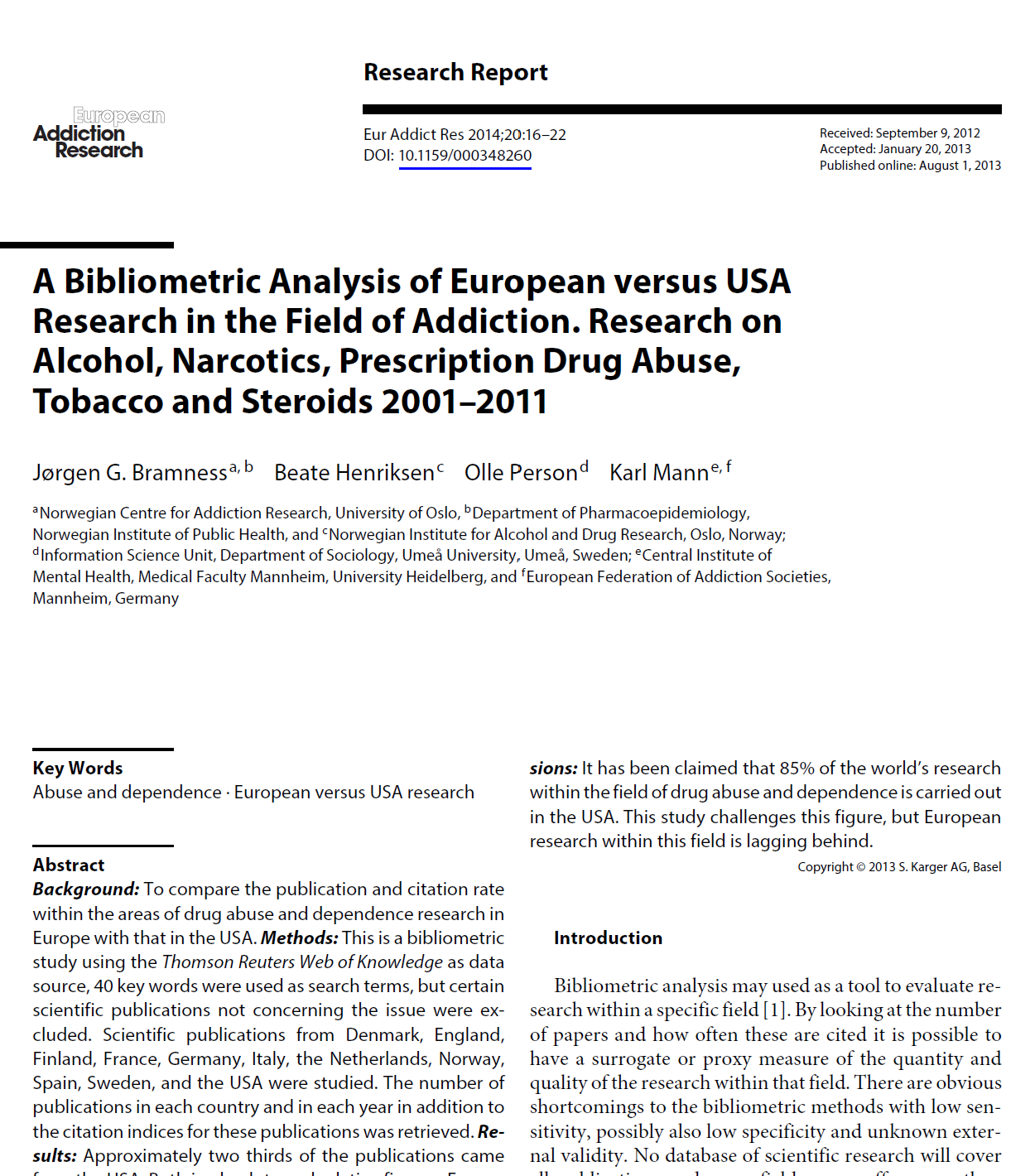 This bibliometric study compares European and U.S. addiction research from 2001–2011. Using Web of Knowledge data, it shows that although the U.S. publishes most articles, Europe contributes substantially. Citation rates are similar, but Europe trails increasingly, underscoring the need for stronger European addiction research.